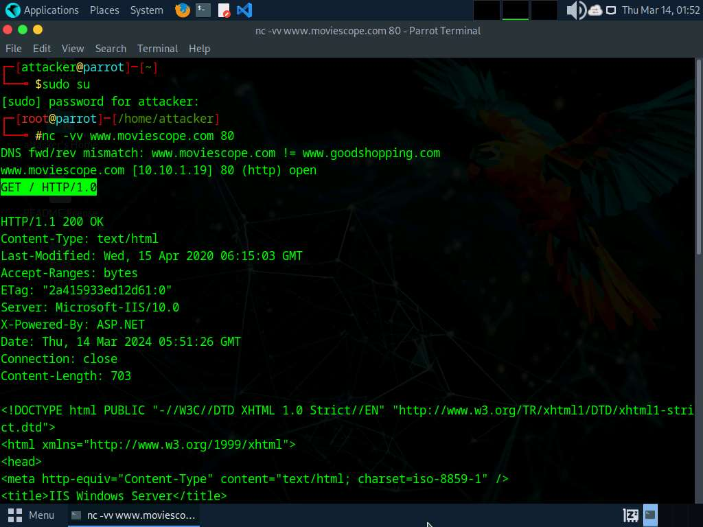 sudo nc -vv www.moviescope.com 80Ora digita GET / HTTP/1.0 e premi Invio due volte