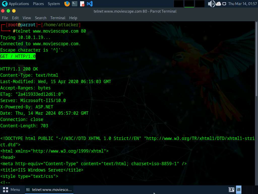 sudo telnet www.moviescope.com 80Ora digita GET / HTTP/1.0 e premi Invio due volte: