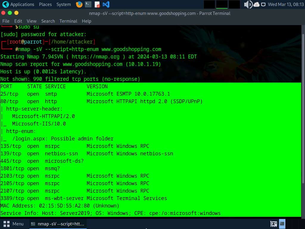 sudo nmap -p80 --script http-waf-detect www.goodshopping.comQuesto comando eseguirà la scansione dell’host e tenterà di determinare se un server Web è monitorato da un IPS, IDS o WAF ed esaminerà l’host di destinazione con payload dannosi e rileverà le modifiche nel codice di risposta.