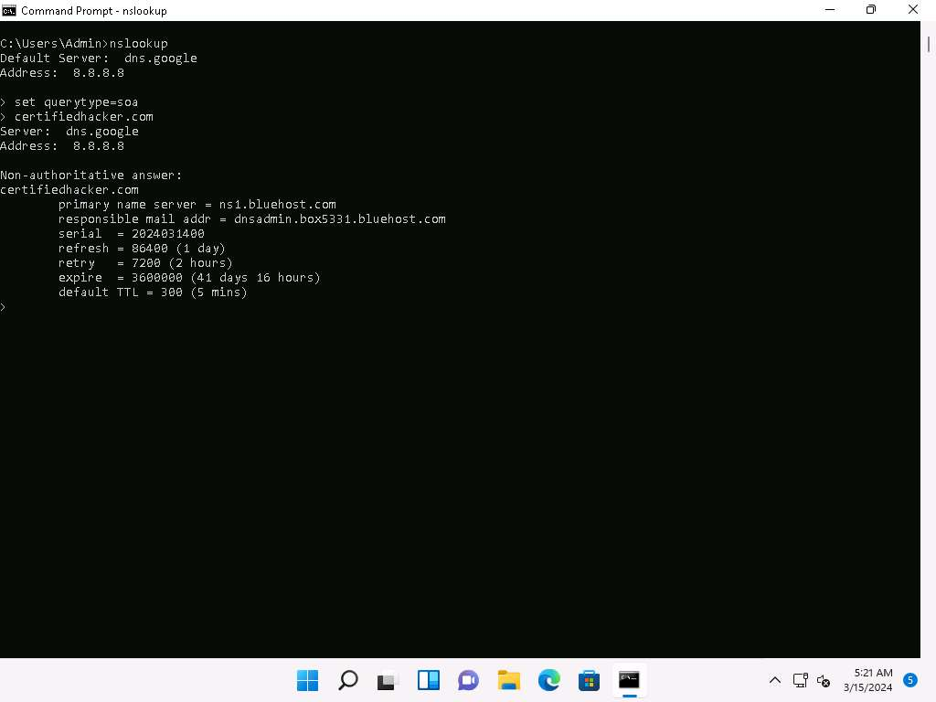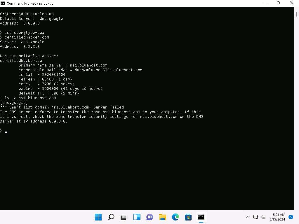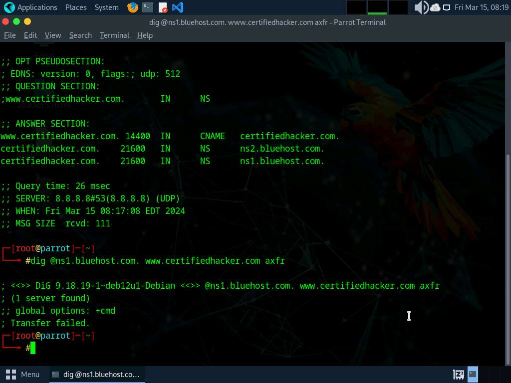 dig ns <dominio di destinazione>Il comando precedente recupera tutti i server dei nomi DNS del dominio di destinazione. Quindi, gli aggressori utilizzano uno dei server dei nomi dall’output del comando precedente per verificare se il DNS di destinazione consente i trasferimenti di zona. Utilizzano il seguente comando a questo scopo: