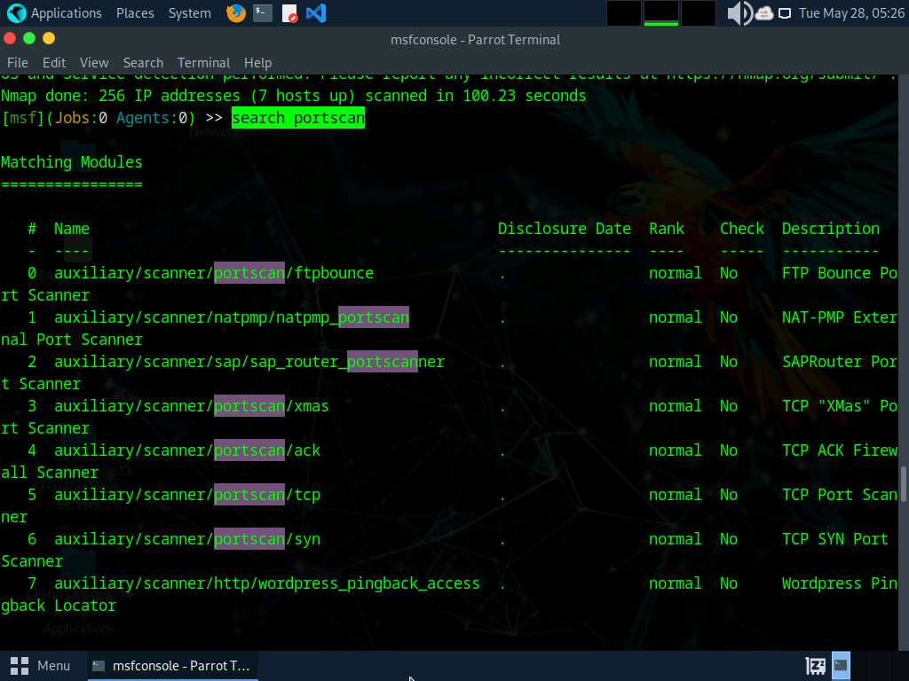 Poi si può scegliere quello che più ci garba, per esempio possiamo utilizzare il SYN scan con il modulo auxiliary/scanner/portscan/syn ed il comando: