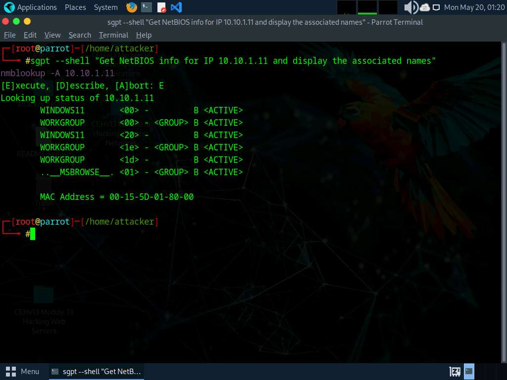 To perform FTP enumeration, run sgpt —shell “Use Nmap to perform FTP Enumeration on www.certifiedhacker.com” command.