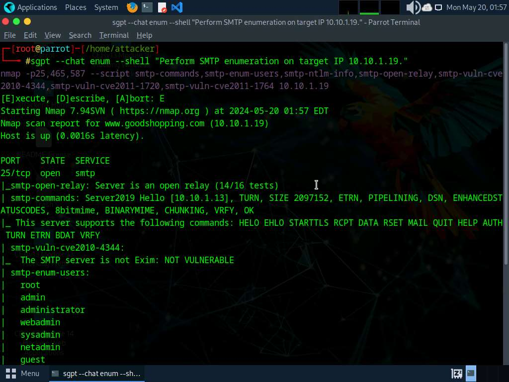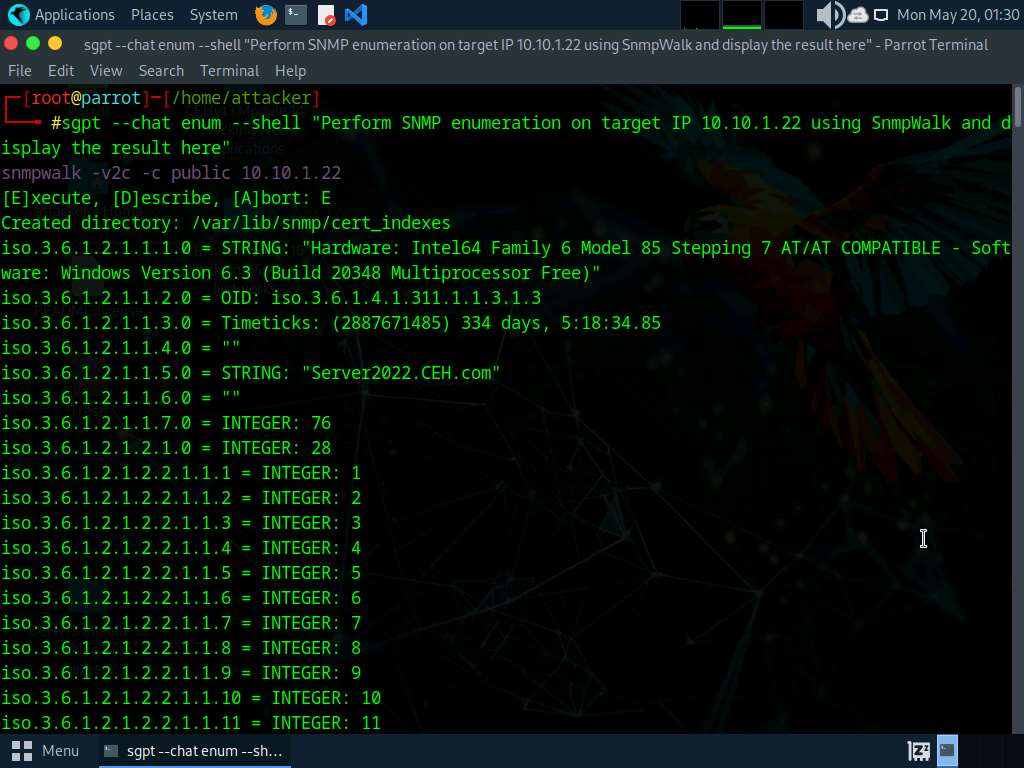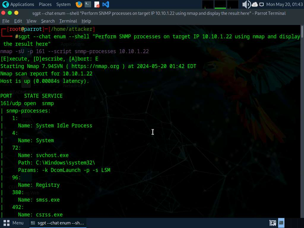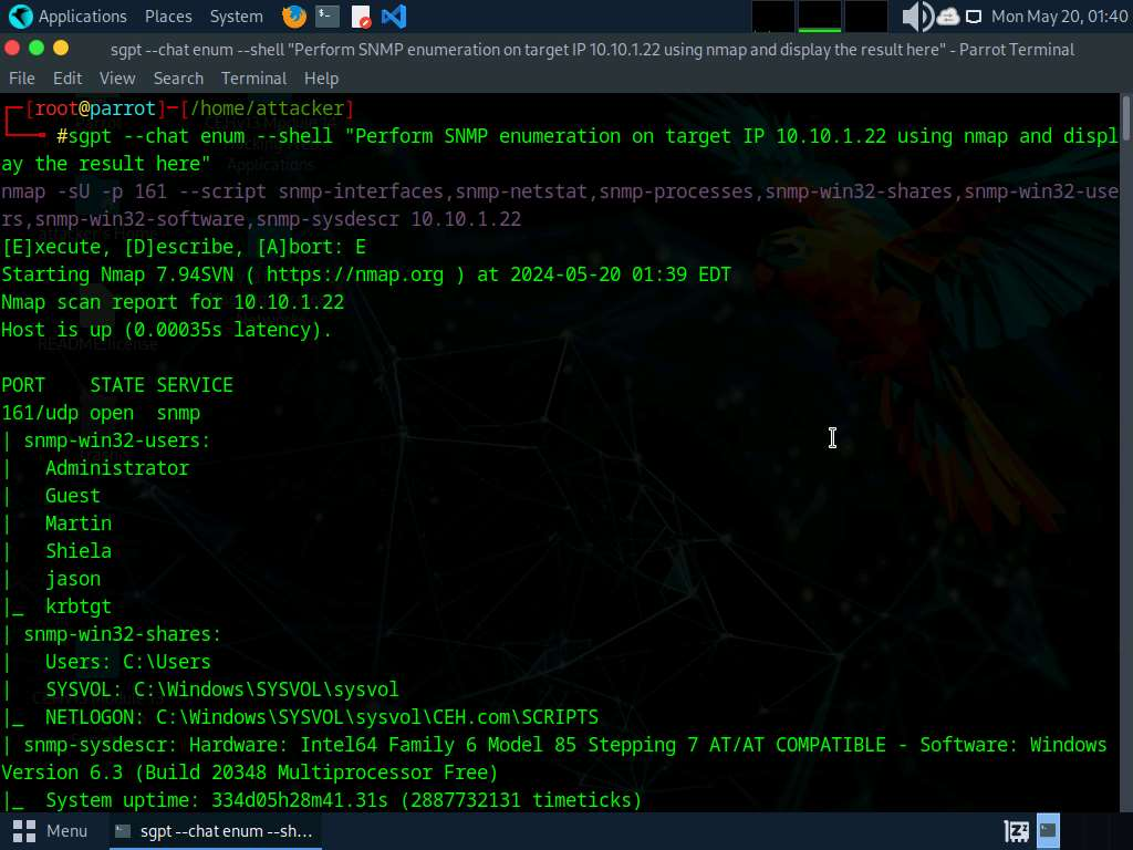 To create and execute a custom script to automate network enumeration tasks run sgpt —chat enum —shell “Develop and execute a script which will automate various network enumeration tasks on target IP range 10.10.1.0/24” command.