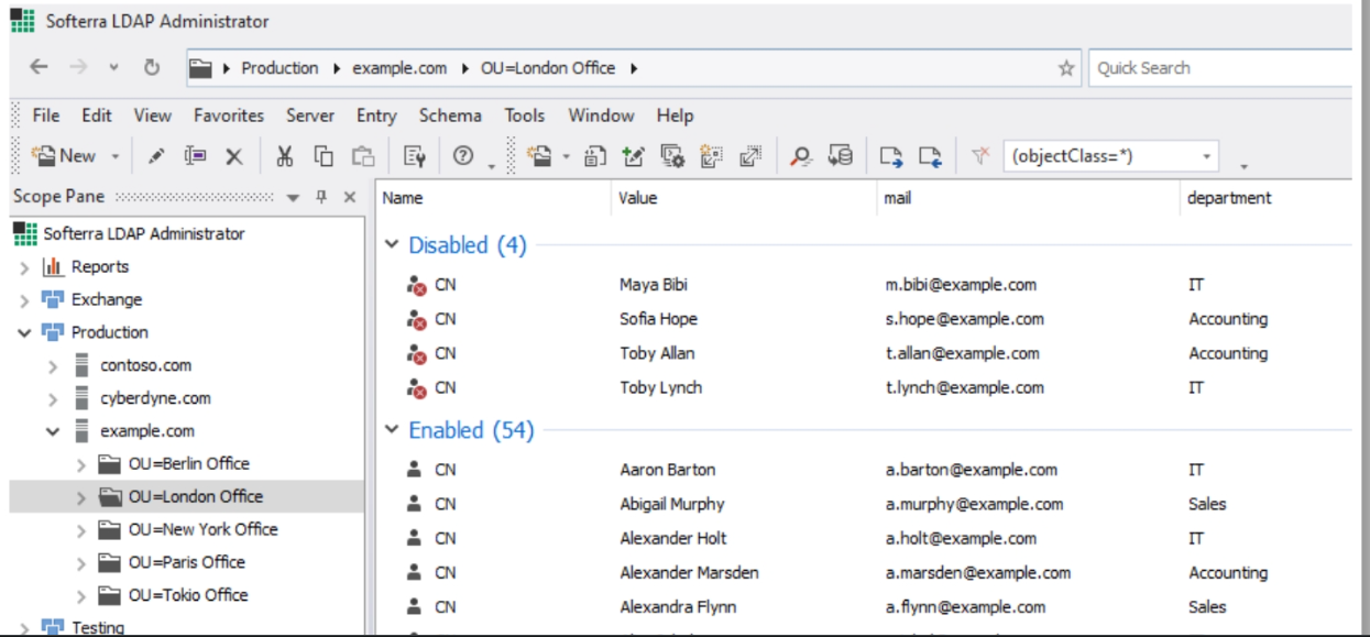 Softerra LDAP Administrator è uno strumento di amministrazione LDAP che funziona con server LDAP come Active Directory (AD), Novell Directory Services e Netscape/iPlanet. Esplora e gestisce le directory LDAP. Come mostrato nello screenshot, gli aggressori utilizzano Softerra LDAP Administrator per enumerare i dettagli utente come nome utente, indirizzo e-mail e reparto: