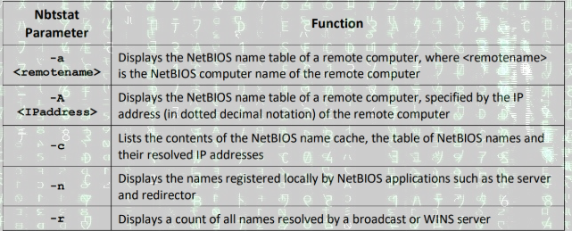 nbtstat [-a <remotename>] [-A <IPaddress>] [-c] [-n] [-r] [-R] [-RR] [-s] [-S] [<interval>][-?]