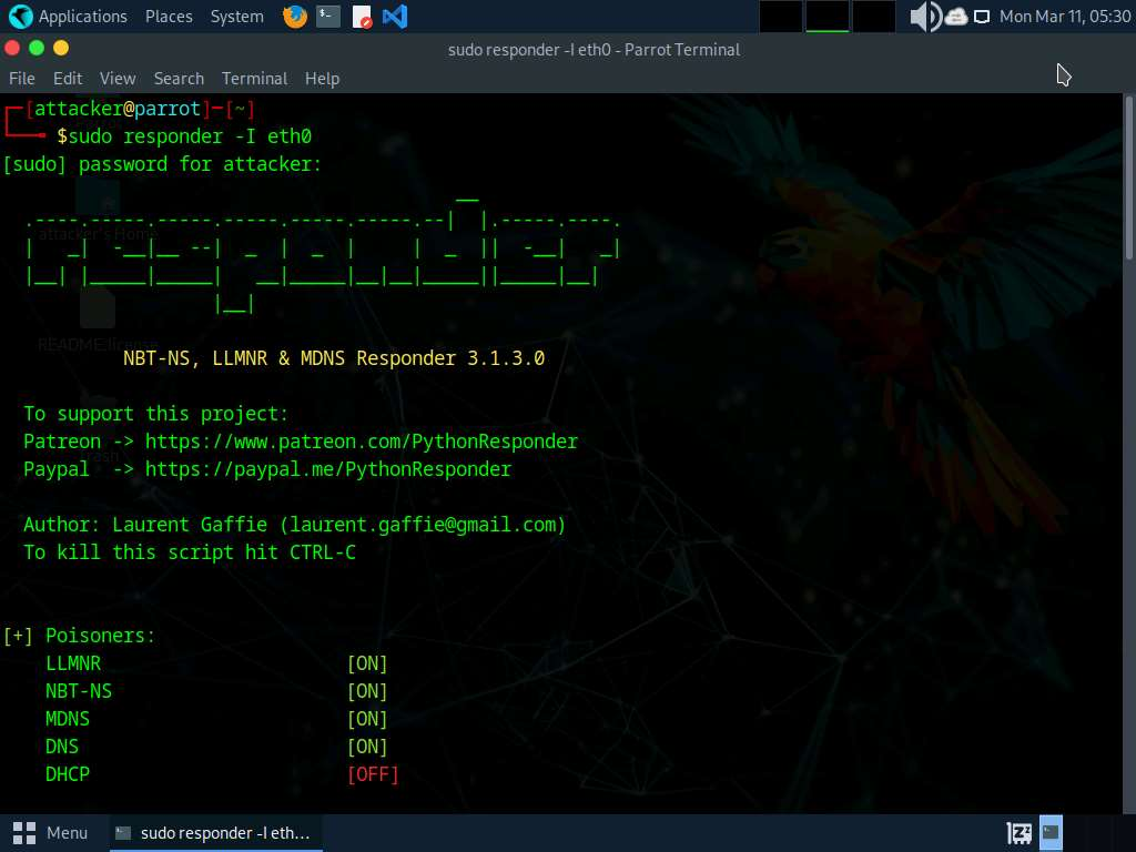 sudo responder -I <interfaccia di rete>Apparirà una pagina di ascolto: