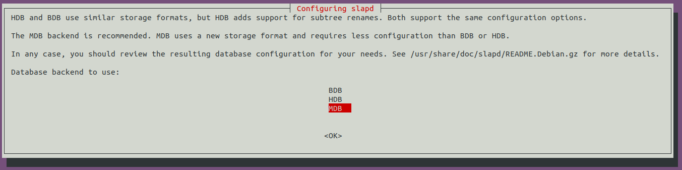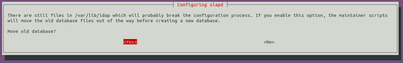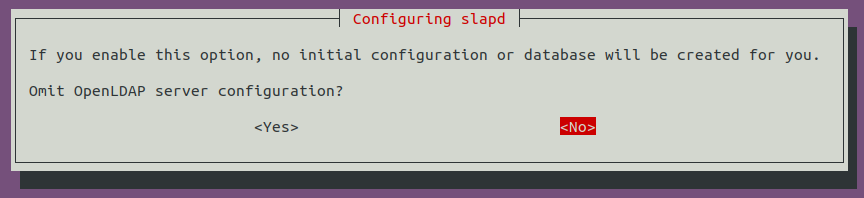 sudo apt-get update && sudo apt-get -y install slapd ldap-utils && sudo systemctl enable slapdsudo dpkg-reconfigure -p low slapdOra alla domanda seguente selezioniamo No: