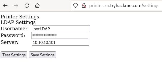 Il nostro server LDAP non autorizzato è stato configurato. Cliccando su “Test Settings” all’indirizzo http://printer.za.tryhackme.com/settings.aspx (in questo caso), l’autenticazione avverrà in chiaro. Se il server LDAP non autorizzato è stato configurato correttamente e sta eseguendo il downgrade della comunicazione, verrà visualizzato il seguente errore: “This distinguished name contains invalid syntax”. Se si riceve questo errore, è possibile utilizzare un tcpdump per acquisire le credenziali utilizzando il seguente comando:
