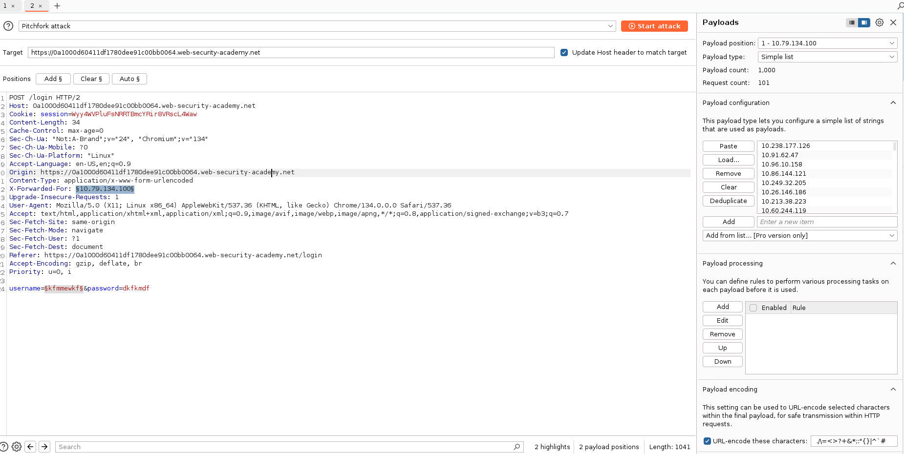 Manda la richiesta all’Intruder, dall’Intruder aggiungi all’header della richiesta X-Forwarded-For: 123.123.123.123 sotto per esempio al Content Type. Ora seleziona sia la sezione dell’utente o della password e la sezione dove è presente l’indirizzo IP dell’ X-Forwarded, selezione l’attacco Pitch Fork e metti come liste la lista con username o password e la lista con gli indirizzi IP, lancia l’attacco e cerca differenze fra i risultati.