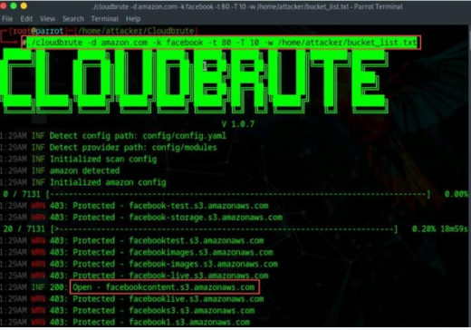 ./cloudbrute -d <target.com> -k <keyword> -t 80 -T 10 -w /<path_to_wordlist>.txt -d amazon.com: Specifies the target bucket hosting domain; here, “amazon.com”. -k facebook: Sets the keyword or pattern to search for within the target domain, here “facebook”. -t 80: Specifies the threads, here 80. -T 10: Sets the timeout option. -w bucket_list.txt: Specifies the wordlist file to use for the attack; here, “bucket_list.txt”.
