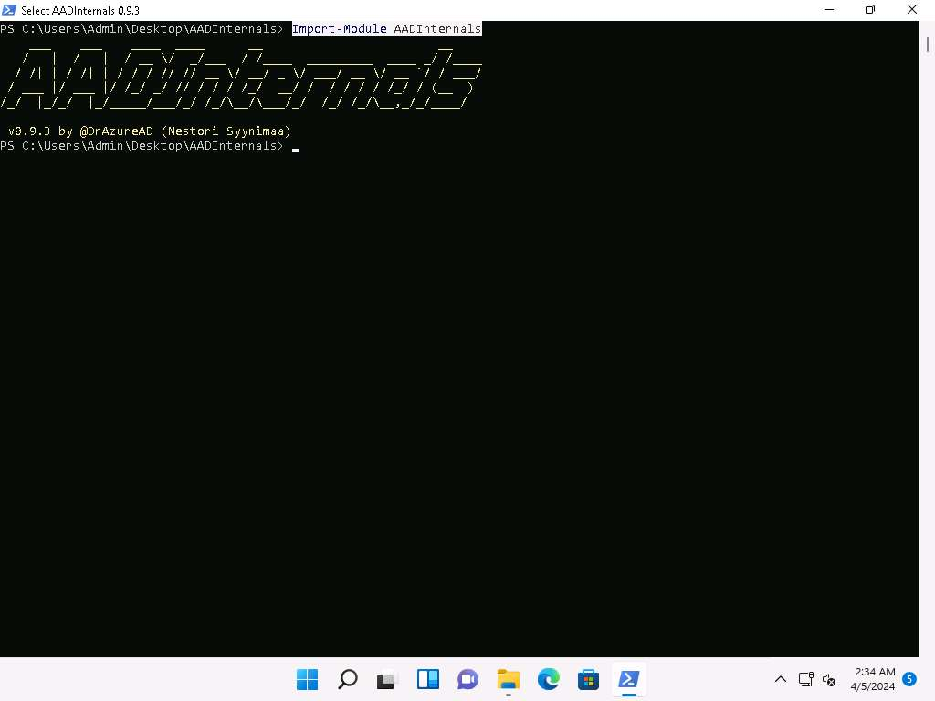 Dopo aver scaricato il software da GithHub (o tramite la cartella CEH) possiamo aprire una powershell e dirigergi all’interno della cartella AADInternals, una volta dentro possiamo lanciare il seguente comando: