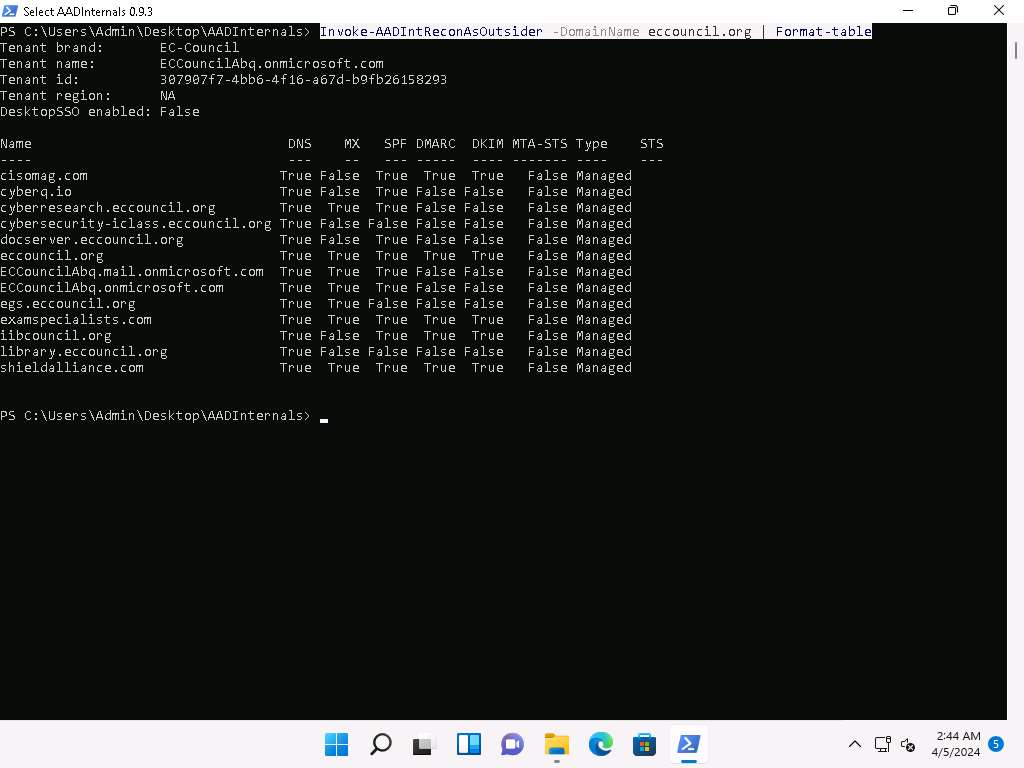 Ora raccoglieremo le informazioni disponibili al pubblico di un Azure AD di destinazione, come il marchio del tenant, il nome del tenant, l’ID del tenant insieme ai nomi dei domini verificati.