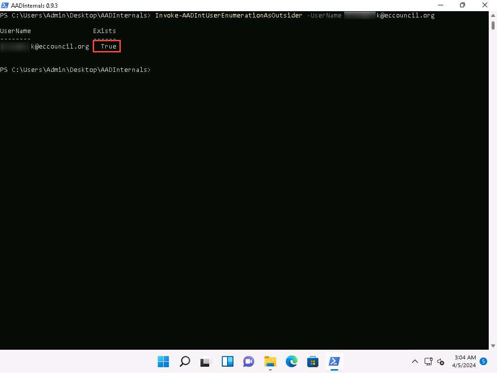 Invoke-AADIntUserEnumerationAsOutsider -UserName [email protected]Sostituendo [email protected] con un probabile utente da verificare.