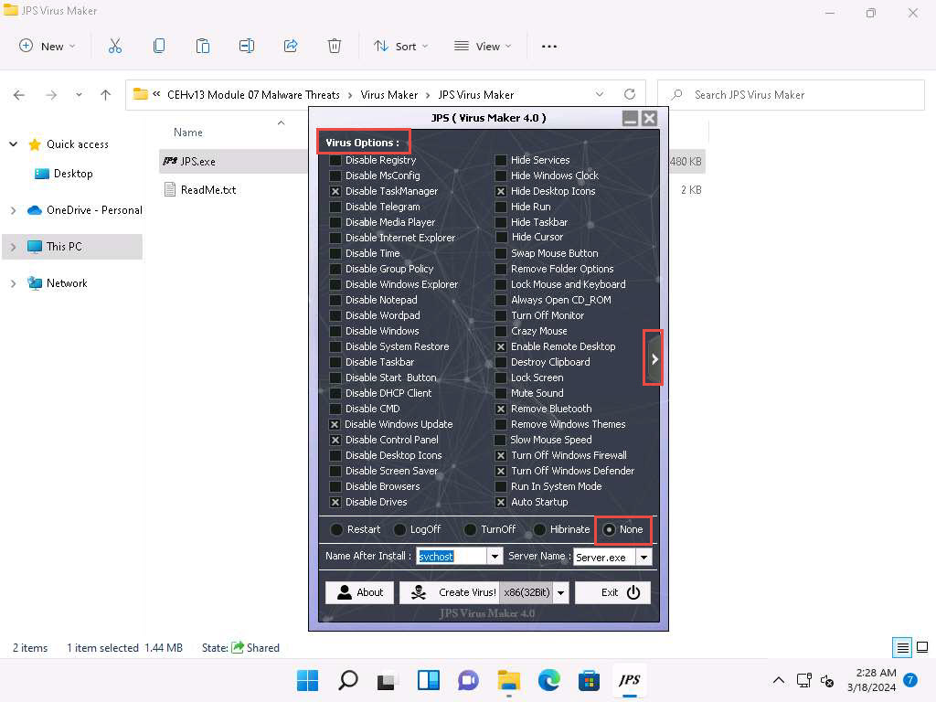 Questo software permette di creare virus e di scegliere fra diverse operazioni che il nostro virus andrà ad eseguire come per esempio cambiare la password dell’utente, disattivare il task manager, disattivare il browser e molto altro. Questo tool è semplicissimo da usare, è sufficiente lanciare il programma e scegliere tra le caselle messe a disposizione dal software, come nell’esempio qui sotto: