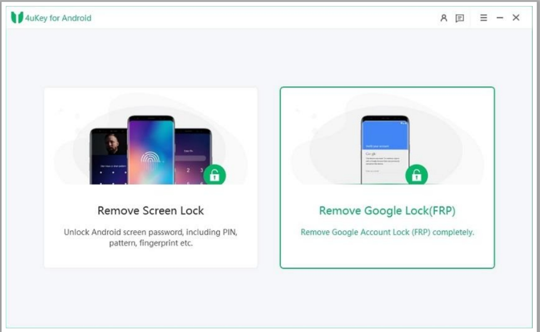 Passaggio 1: avvia 4ukey e collega il dispositivo Android bloccato al computer → Fare clic sull’opzione “Rimuovi Google Lock (FRP)”