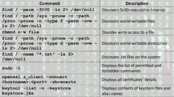 find / -type f -perm 0777 #Cerca tutti i file che hanno tutti i permessifind / -perm -4000 2>/dev/null #Cerca tutti i binari eseguibili da root'find / -name "*.txt" -ls 2> /dev/null ' #Cerca tutti i file .txt