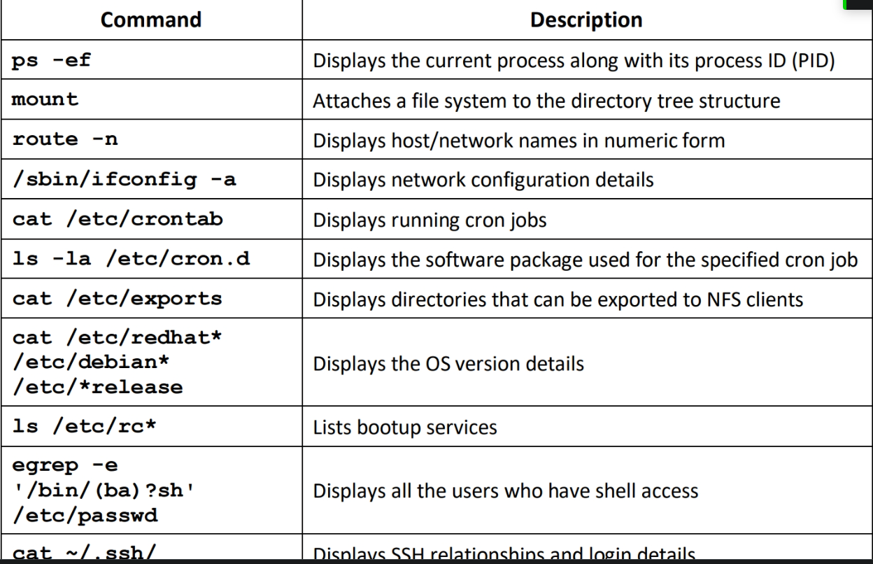 history #Fa vedere i comandi usati dagli utenti precedentiifconfig #Fa vedere le interfacce di reteip route #Fa vedere i percorsi delle retihostname #Fa vedere il nome uteneuname -a #Da informazioni sul kernel finger #Da molte informazioni generali/proc/version #Fa vedere i processi in corso/etc/issue #Fa vedere informazioni sul sistema operativops -A #Fa vedere i processi in corsops axjf #Fa vedere un albero dei processips aux #Fa vedere i processi di tutti gli utenti ps -ef #Visualizza il processo corrente insieme al suo ID di processo (PID)env #Fa vedere le variabili di ambientenetstat -a #Fa vedere tutte le porte in ascolto e le connessioni stabilitenetstat -lt #mostra tutte le porte in ascolto sul protocollo tcpnetstat -lu #mostra tutte le porte in ascolto sul protocollo udpnetstat -i #mostra lo stato delle varie retiwhoamiidsudo -l