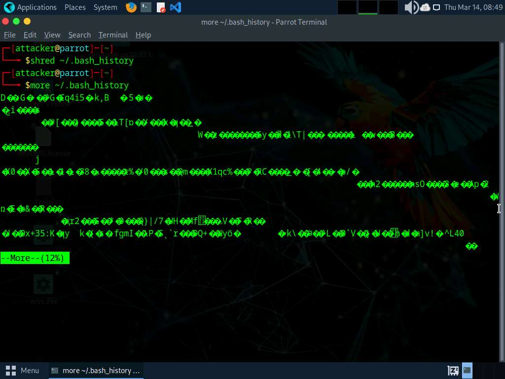 Inoltre possiamo eseguire il comando ~shred/.bash_history per distruggere il file cronologico, rendendone illeggibile il contenuto. Questo comando è utile nei casi in cui un investigatore individua il file; grazie a questo comando, non sarebbe in grado di leggere alcun contenuto nel file cronologico.