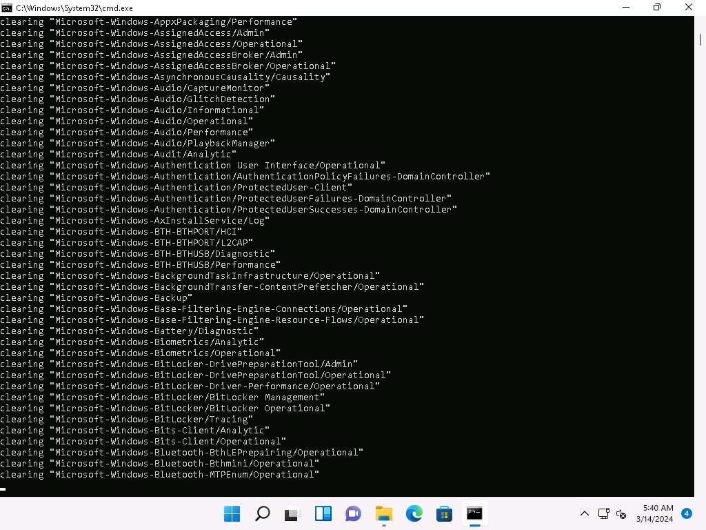 FOR /F "tokens=*" %G IN ('wevtutil el') DO wevtutil cl "%G"Cipher