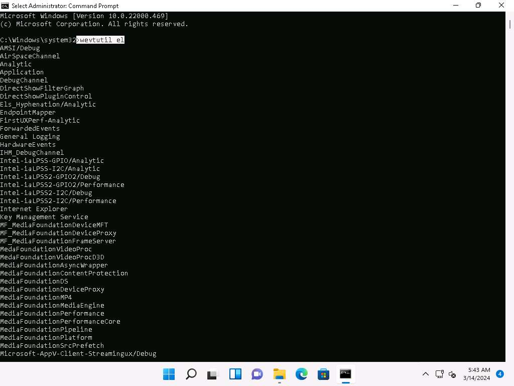 Per listare tutti i nomi dei log presenti sulla pacchina possiamo utilizzare il comando wevtutil el.