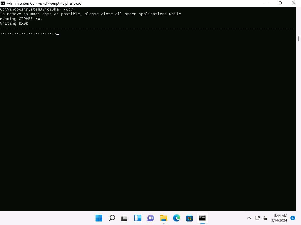 Il programma Cipher.exe inizia a sovrascrivere i file eliminati, prima con tutti zeri (0x00); poi con tutti 255 (0xFF); e infine con numeri casuali. Cipher.exe è uno strumento da riga di comando integrato di Windows che può essere utilizzato per eliminare in modo sicuro un blocco di dati sovrascrivendolo per impedirne il possibile recupero. Questo comando aiuta anche a crittografare e decrittografare i dati nelle partizioni NTFS. Quando un aggressore crea un file di testo dannoso e lo crittografa, al momento del processo di crittografia viene creato un file di backup. Pertanto, nei casi in cui il processo di crittografia viene interrotto, il file di backup può essere utilizzato per recuperare i dati. Dopo il completamento del processo di crittografia, il file di backup viene eliminato, ma questo file eliminato può essere recuperato utilizzando un software di recupero dati e può essere ulteriormente utilizzato dal personale di sicurezza per le indagini. Per evitare il recupero dei dati e per coprire le proprie tracce, gli aggressori utilizzano lo strumento Cipher.exe per sovrascrivere i file eliminati.