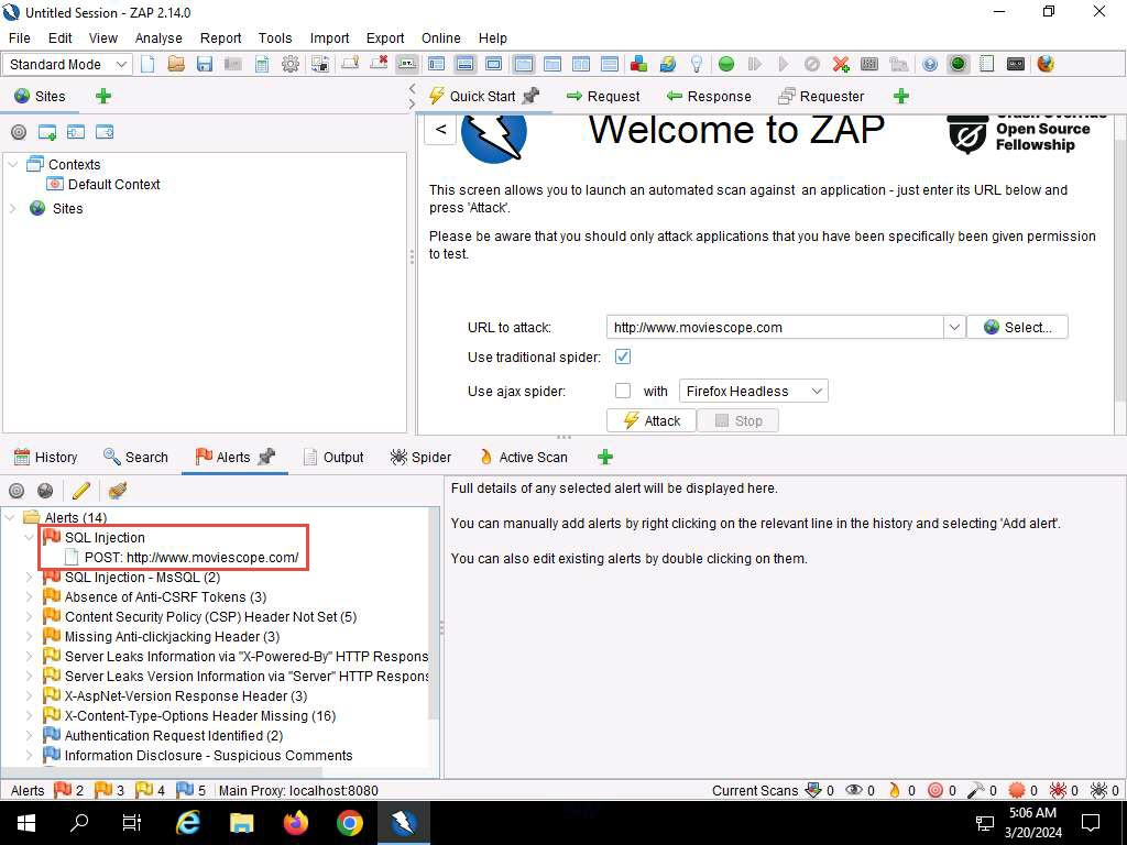 Dopo aver aspettato che finisca lo scan possiamo dirigerci alla sezione Alerts e vedere i risultati cliccando nella sezione SQL: