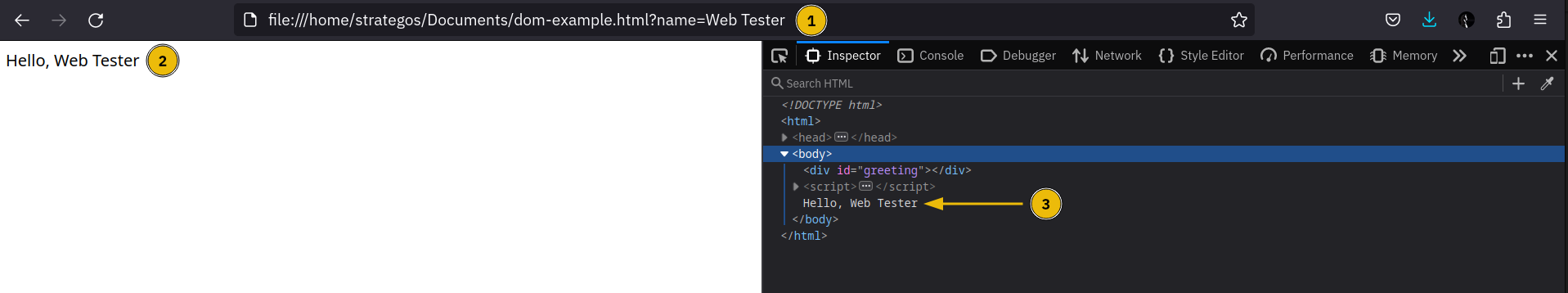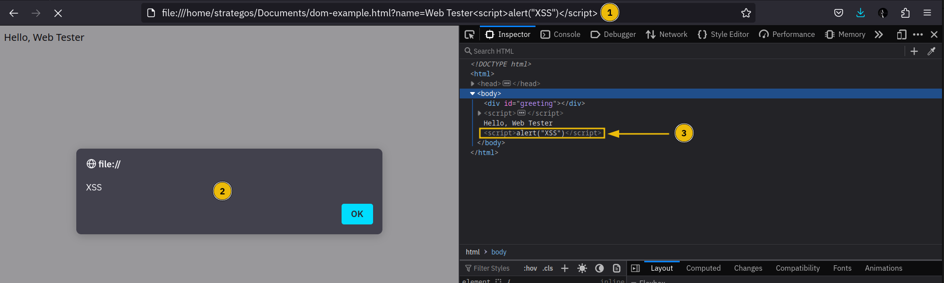 Prima di immergerci in XSS basato su DOM, esaminiamo cos’è il Document Object Model (DOM). Il DOM è un’interfaccia di programmazione che rappresenta un documento Web come un albero. Il DOM consente di accedere e manipolare a livello di programmazione le diverse parti di un sito Web utilizzando JavaScript. Consideriamo un esempio pratico. Consideriamo il codice HTML di example.com nello screenshot qui sotto (come recuperato il primo febbraio 2024). Abbiamo aperto Web Developer Tools utilizzando il browser Web Firefox e controllato la scheda Inspector.